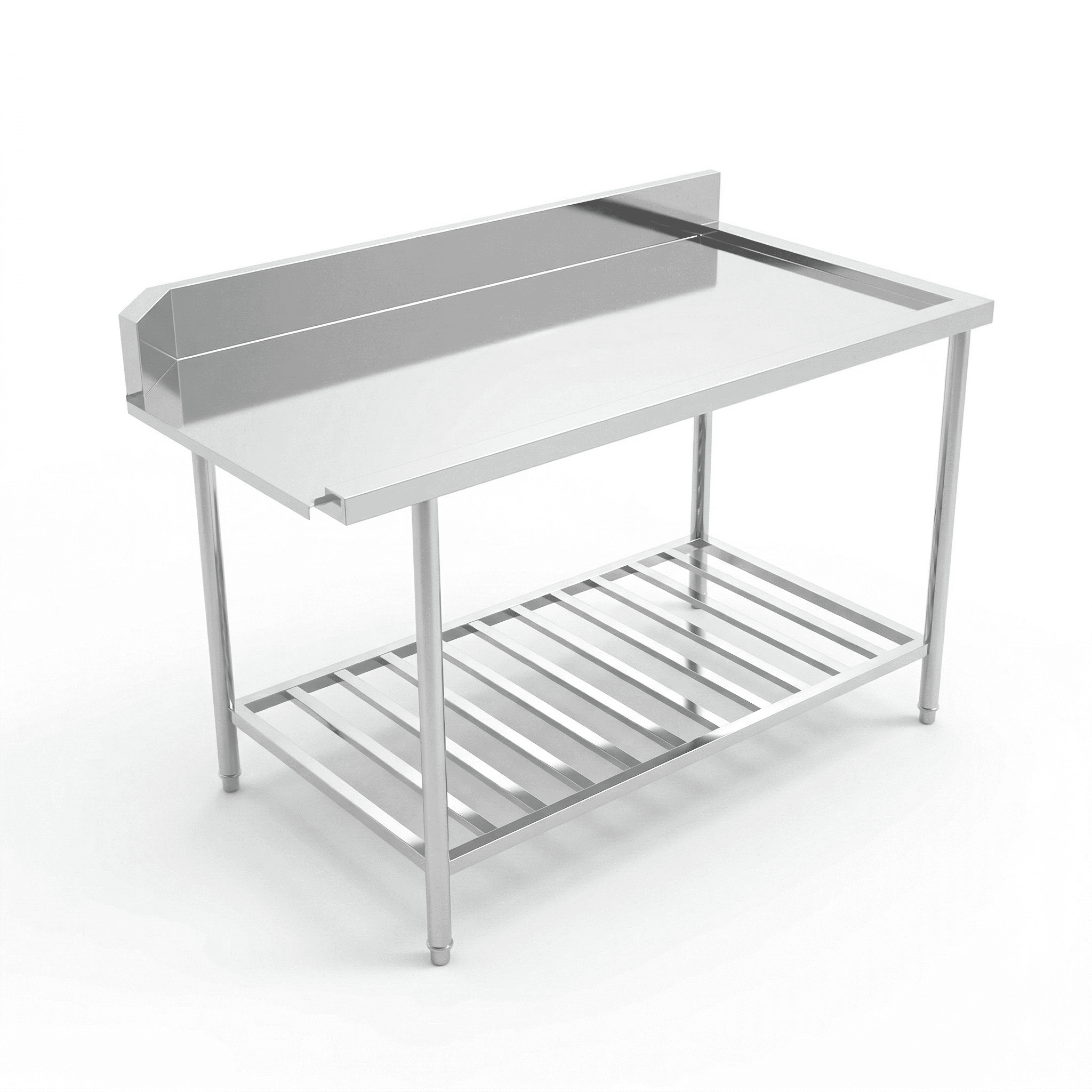 Đặc điểm: Mặt bàn inox thiết kế có gờ chắn nước kết nối trực tiếp với đầu ra của máy rửa chén công nghiệp.