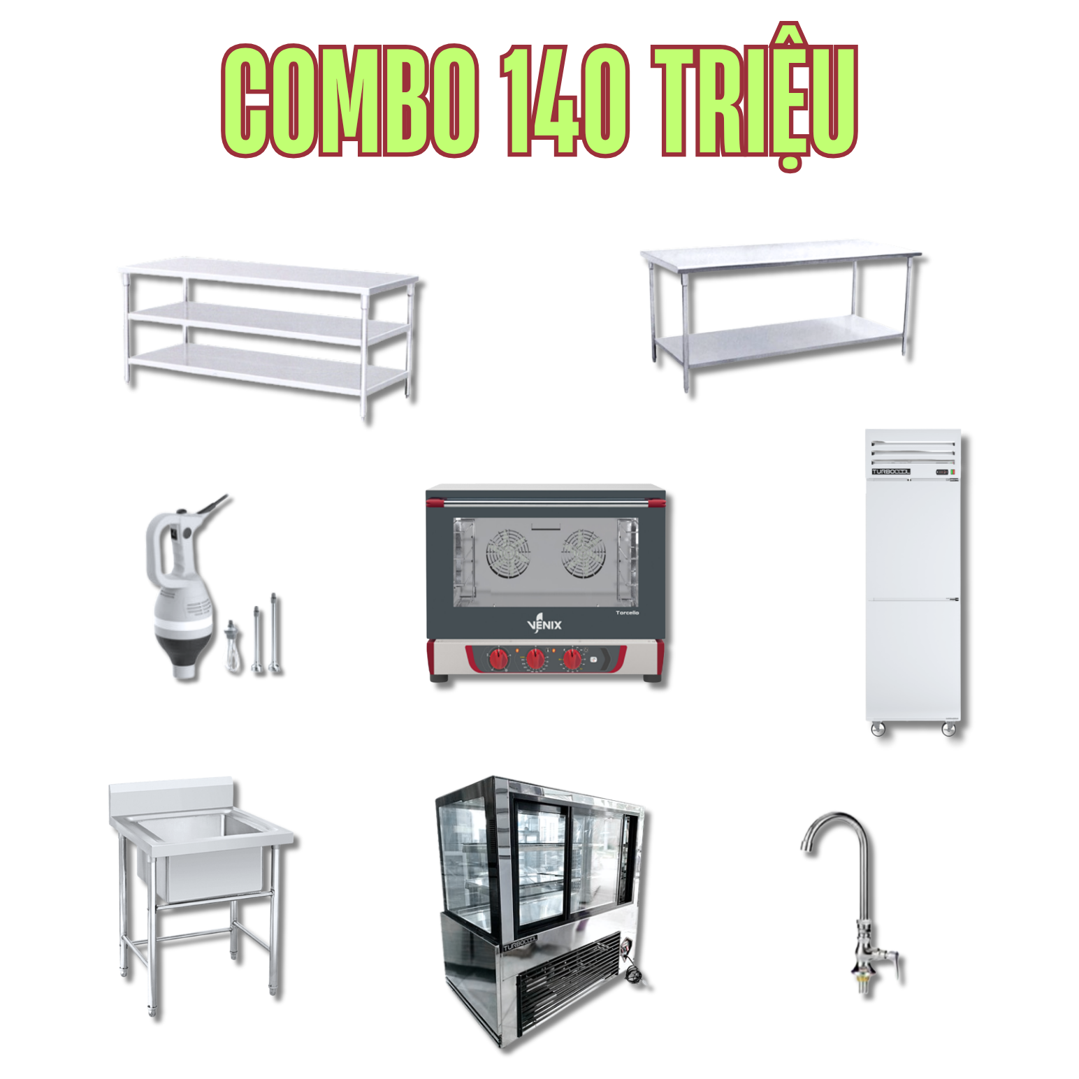 Combo thiết bị làm bánh mang đến giải pháp tối ưu cho mô hình kinh doanh thức ăn nhanh và mang đi. Bộ sản phẩm bao gồm đầy đủ các thiết bị chuyên dụng cần thiết để vận hành một tiệm bánh nhỏ gọn hiệu quả, bao gồm: